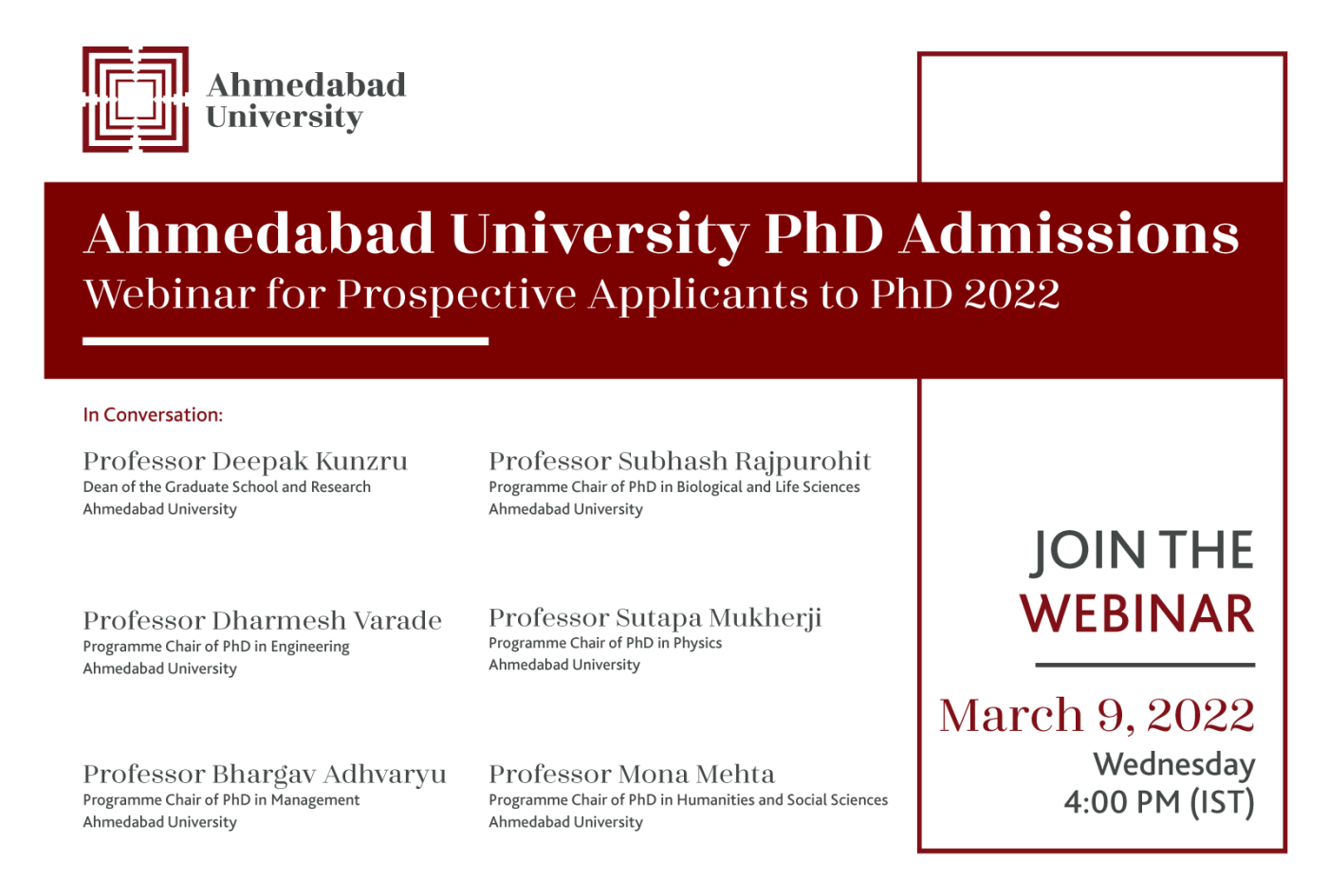 Ahmedabad University is organising an exclusive PhD Admissions Webinar on March 9, 2022. The webinar will have as speakers Ahmedabad University’s Professor Deepak Kunzru, Dean of the Graduate School and Research; Professor Dharmesh Varade, Programme Chair of PhD in Engineering; Professor Bhargav Adhvaryu, Programme Chair of PhD in Management; Professor Subhash Rajpurohit, Programme Chair of PhD in Biological and Life Sciences; Professor Sutapa Mukherji, Programme Chair of PhD in Physics; and Professor Mona Mehta, Programme Chair of PhD in Humanities and Social Sciences. They will highlight the key features of the PhD programmes at Ahmedabad University.