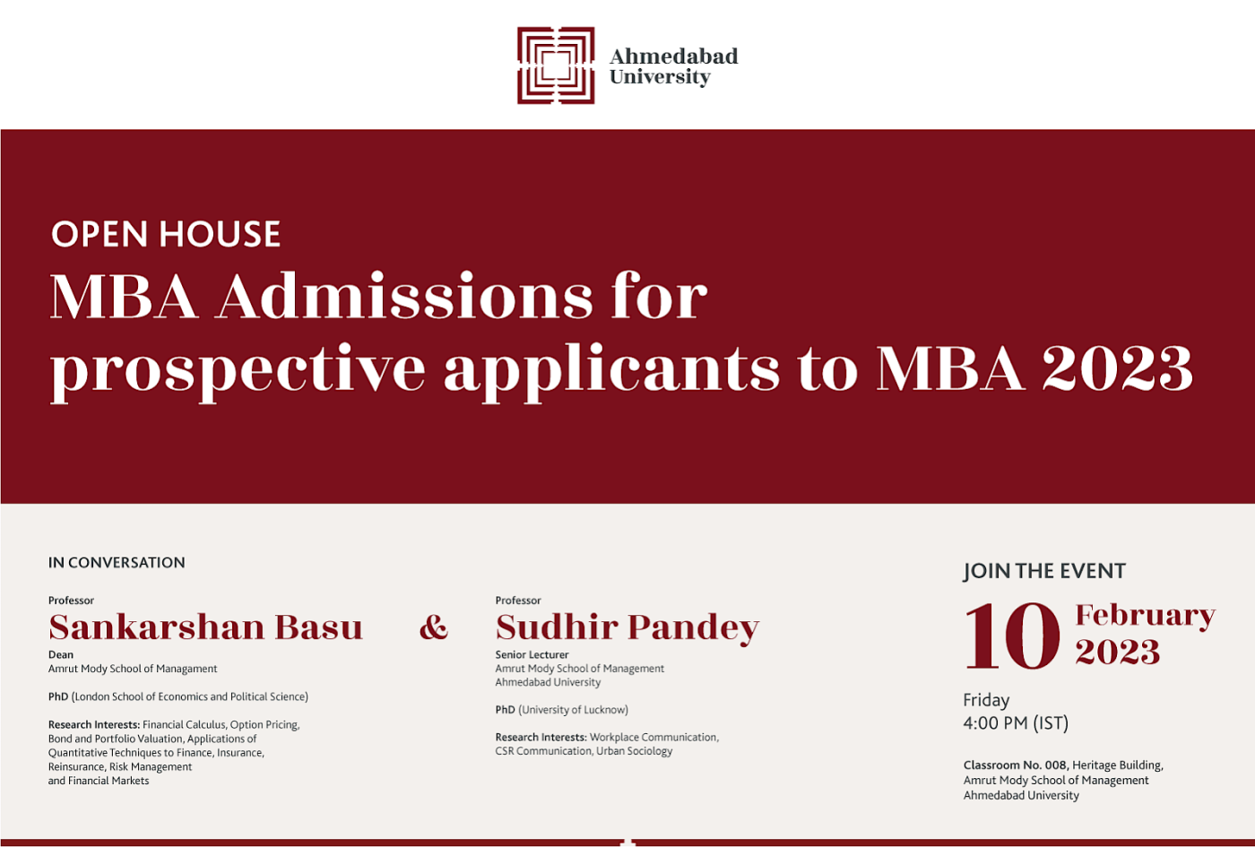Venue: Classroom No. 008, Heritage Building, Amrut Mody School of Management