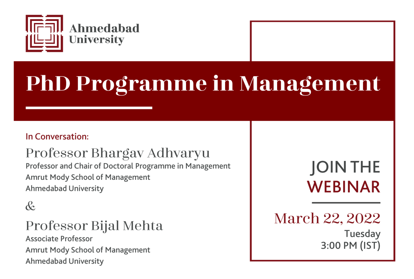 Professor Bhargav Adhvaryu (Professor and Chair of the Doctoral Programme in Management) and Professor Bijal Mehta (Associate Professor) at the Amrut Mody School of Management shall conduct a webinar on the doctoral programme in management.