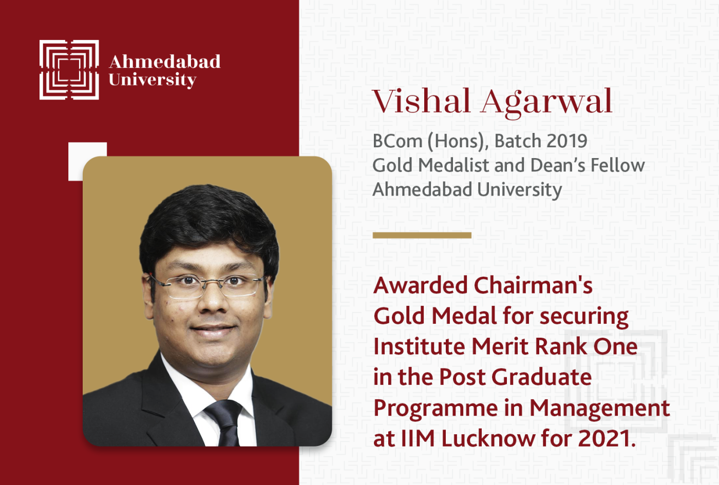 Vishal Agarwal, an alumnus of Ahmedabad University, has been awarded the Chairman's Gold Medal for securing Institute Merit Rank One in the Postgraduate Programme in Management at the Indian Institute of Management (IIM) Lucknow for 2021.