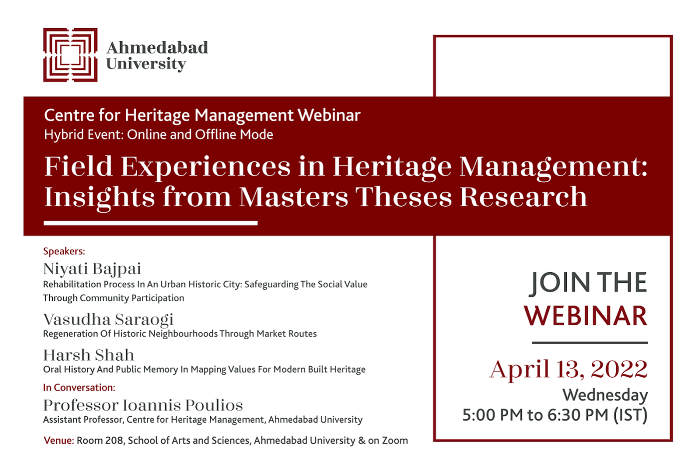 In the first edition of the Thesis Research talk series, the focus will be on the topic ‘Field Experiences in Heritage Management: Insights from Masters Theses Research’. Our graduates Harsh Shah, Niyati Bajpai, and Vasudha Saraogi will be discussing with Professor Ioannis Poulios, Associate Professor, Amrut Mody School of Management, Ahmedabad University, their experiences of different theses research carried out at the old city of Ahmedabad, a UNESCO World Heritage Site.