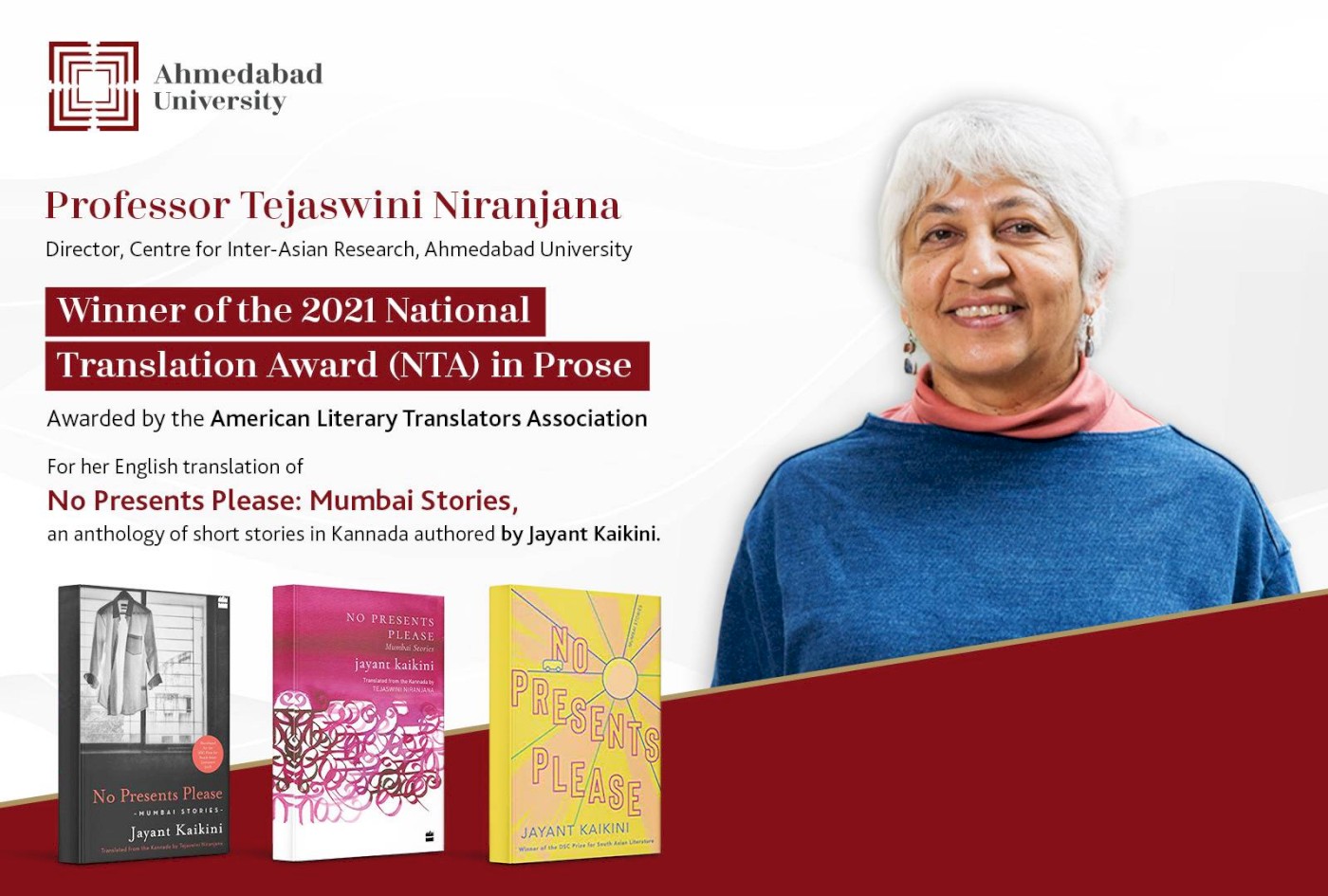 Professor Tejaswini Niranjana, Director, Centre for Inter-Asian Research, Ahmedabad University, has won the prestigious 2021 National Translation Award (NTA) in Prose by the American Literary Translators Association (ALTA) for her English translation of No Presents Please: Mumbai Stories, an anthology of short stories in Kannada authored by Jayant Kaikini.