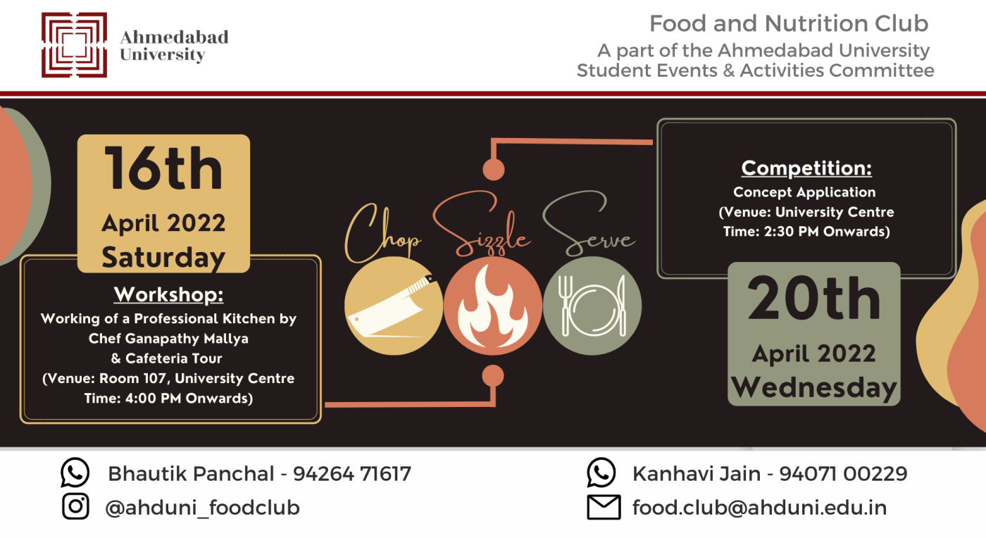 Chop Sizzle Serve is a two-event series where one can learn and express one's cooking skills.
