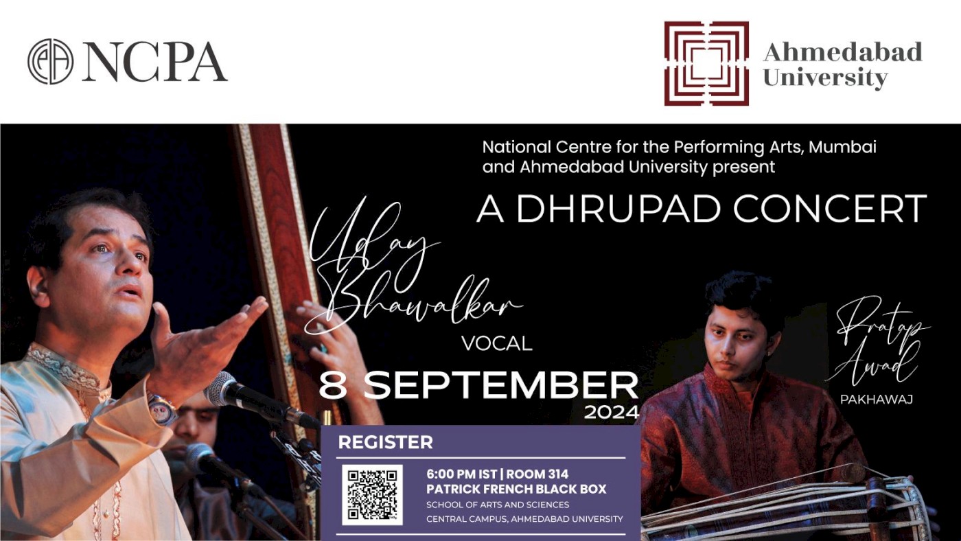 National Centre for the Performing Arts, Mumbai, and Ahmedabad University are delighted to invite you to a Hindustani Music recital in the Dhrupad style by Uday Bhawalkar (Vocal) accompanied by Pratap Awad (Pakhawaj)
