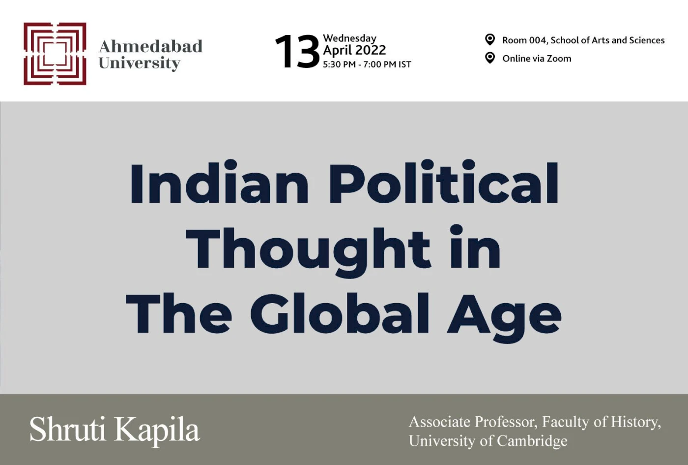 Speaker bio: Shruti Kapila is Associate Professor in the Faculty of History at the University of Cambridge and a Fellow, Tutor and the Director of Studies at Corpus Christi College, Cambridge. Author of Violent Fraternity: Indian Political Thought in the Global Age (Princeton, 2021) she is the editor of An Intellectual History for India and the co-editor of Political Thought in Action: The Bhagavad Gita and Modern India. Her writing has appeared in leading academic journals such as Past and Present, Public Culture and Modern Intellectual History and in international publications such as the Financial Times, India Today, Prospect, Al Jazeera and The Print India.