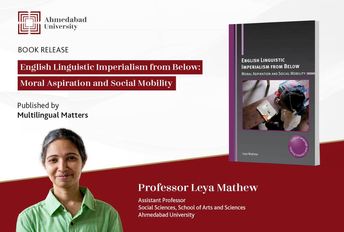 Professor Leya Mathew’s book English Linguistic Imperialism from Below maps the experiences and aspirations of low-income and Dalit mothers, and an unexpected politics that unfolds through and around low-fee private English-medium schooling. The book demonstrates how English has been newly constituted as a dominant language in post-market reform India through the fervent aspirations of non-elites and the zealous reforms of English Language Teaching experts. The most recent spread of English in India has been through low-fee private schools, which are perceived as dubious yet efficient. The book is an ethnography of mothering at one such low-fee private school and its neighbouring state-funded school. It demonstrates that political economic transitions, experienced as radical social mobility, fuelled intense desire for English schooling. Rather than English schooling leading to social mobility, new experiences of mobility necessitated English schooling. At the same time, experts have responded to the unanticipated spread of English by transforming it from a second language to a first language, and earlier hierarchies have been produced anew as access to English democratised.