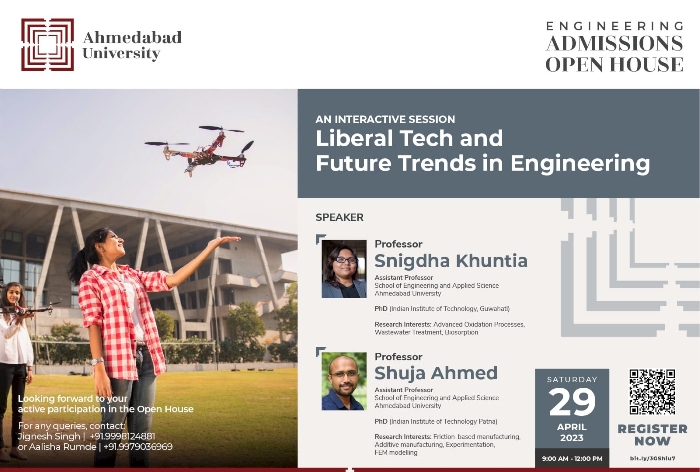 A BTech Open House invitation to all students, parents, and educators to learn about the Engineering programme at Ahmedabad University and its focus on solving engineering problems by understanding their social, economic, and business contexts.