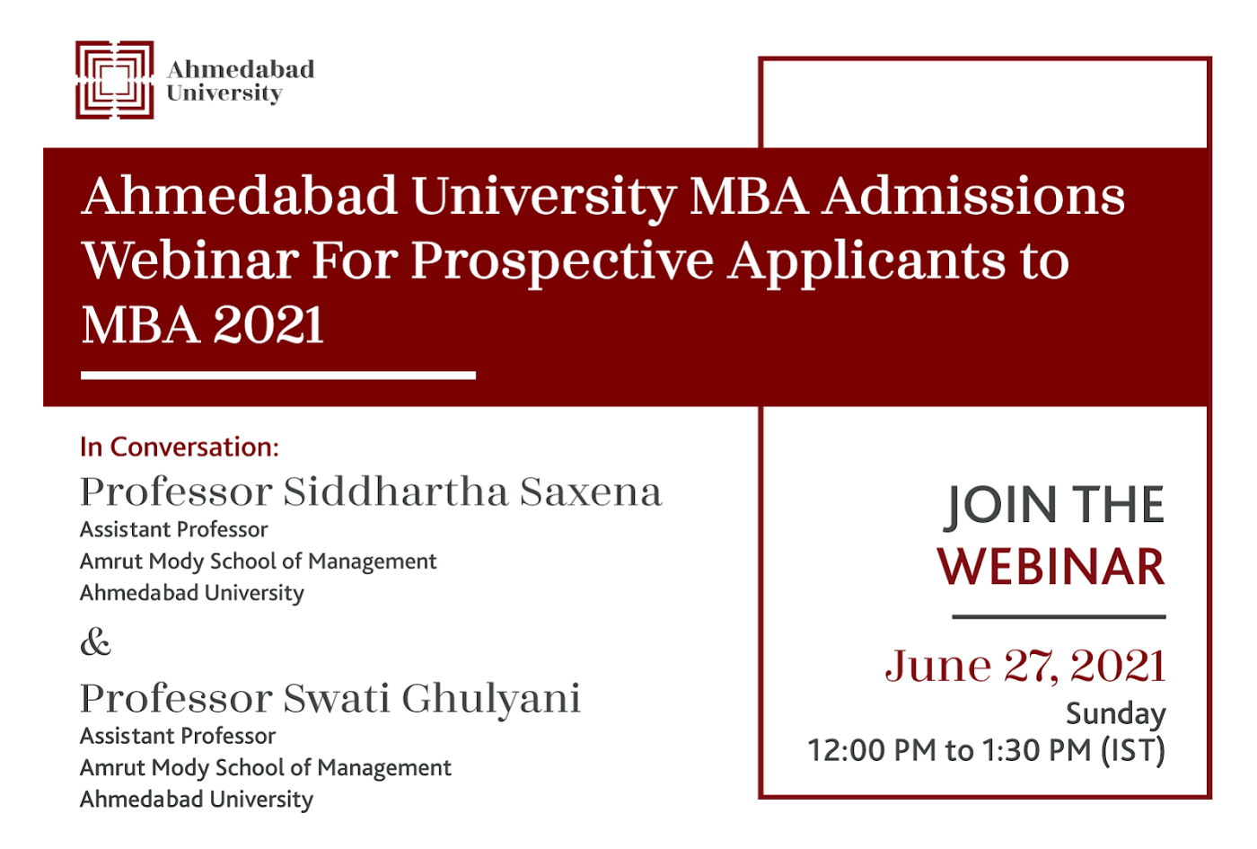 Ahmedabad University is organising an exclusive MBA programme admissions webinar which is going to take place on Sunday, 27 June 2021 at 12.00 pm.
