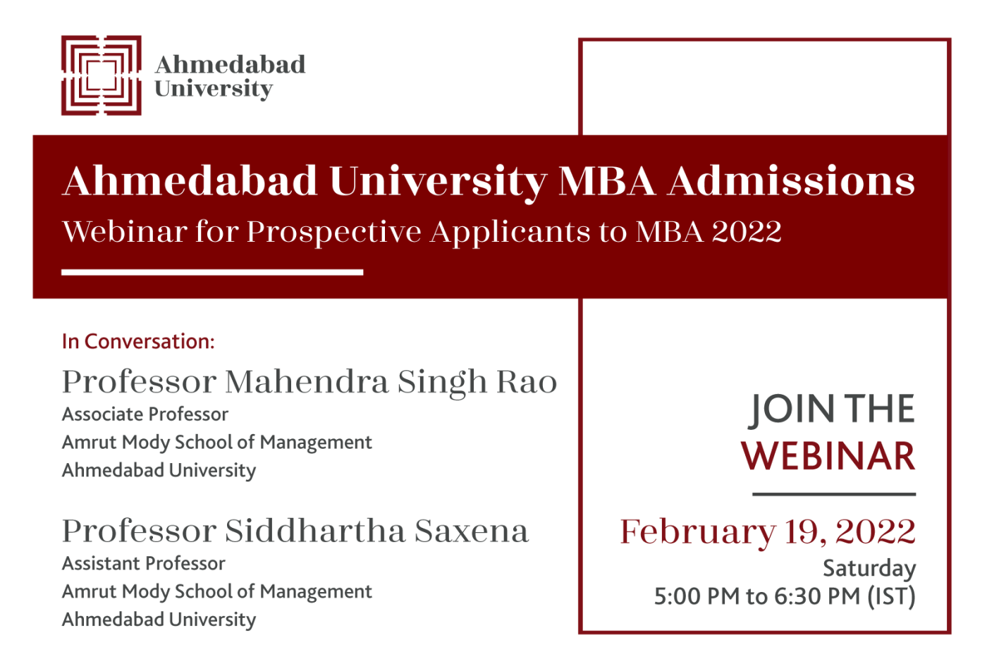 Ahmedabad University is organising an exclusive MBA Programme Admissions Webinar on February 19, 2022 at 5.00 pm. The webinar will be chaired by Professor Mahendra Singh Rao (Associate Professor), Professor Siddhartha Saxena (Assistant Professor), representatives of MBA Programme participants, and Mr Swetangkumar Panchal (Manager - MBA Admissions and Branding) to address the queries and doubts of prospective MBA applicants of the upcoming MBA 2022 batch.