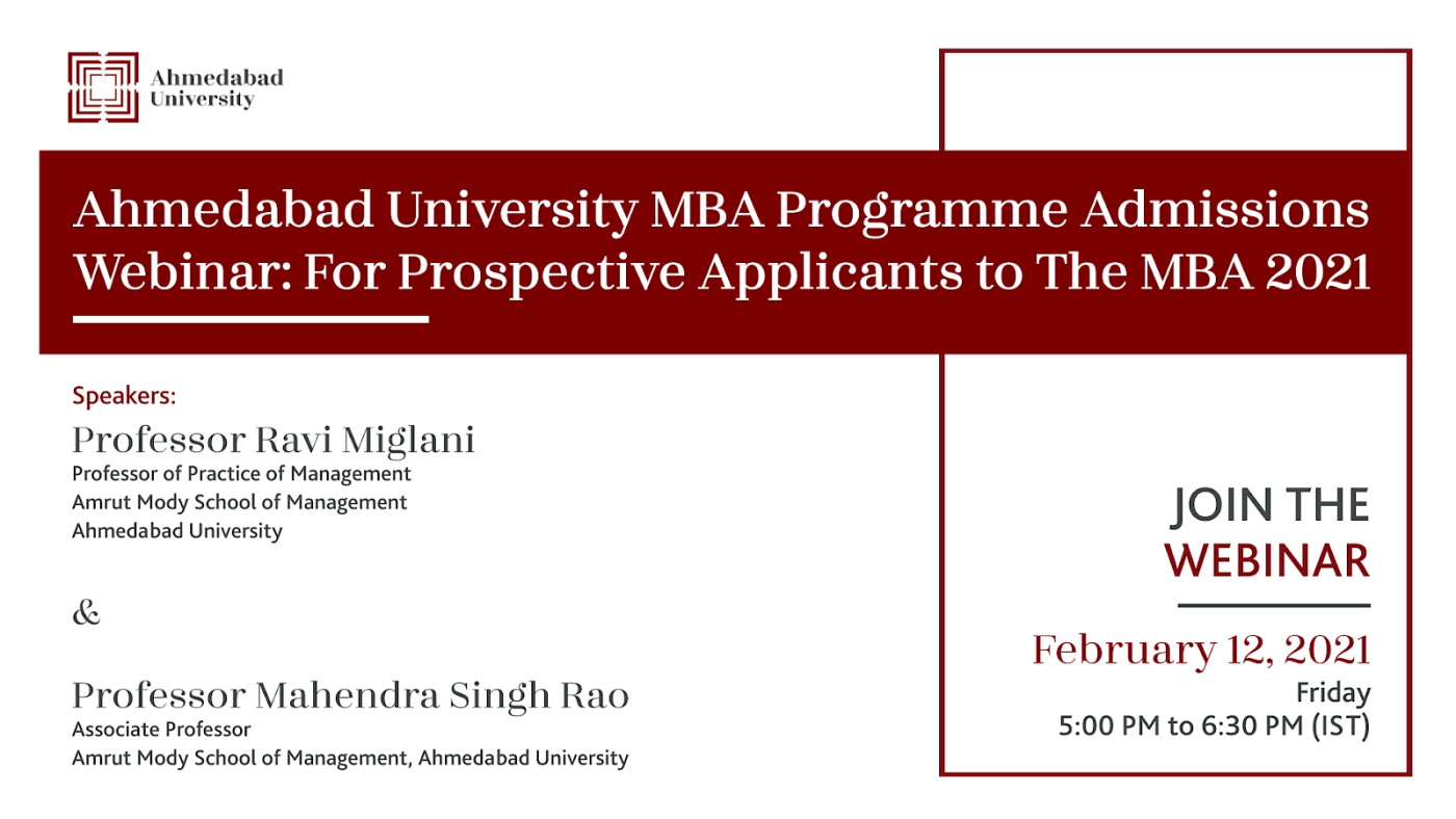 Ahmedabad University is organising an exclusive mba programme admissions webinar which is going to take place on friday, 12 February 2021 at 5.00 pm.
