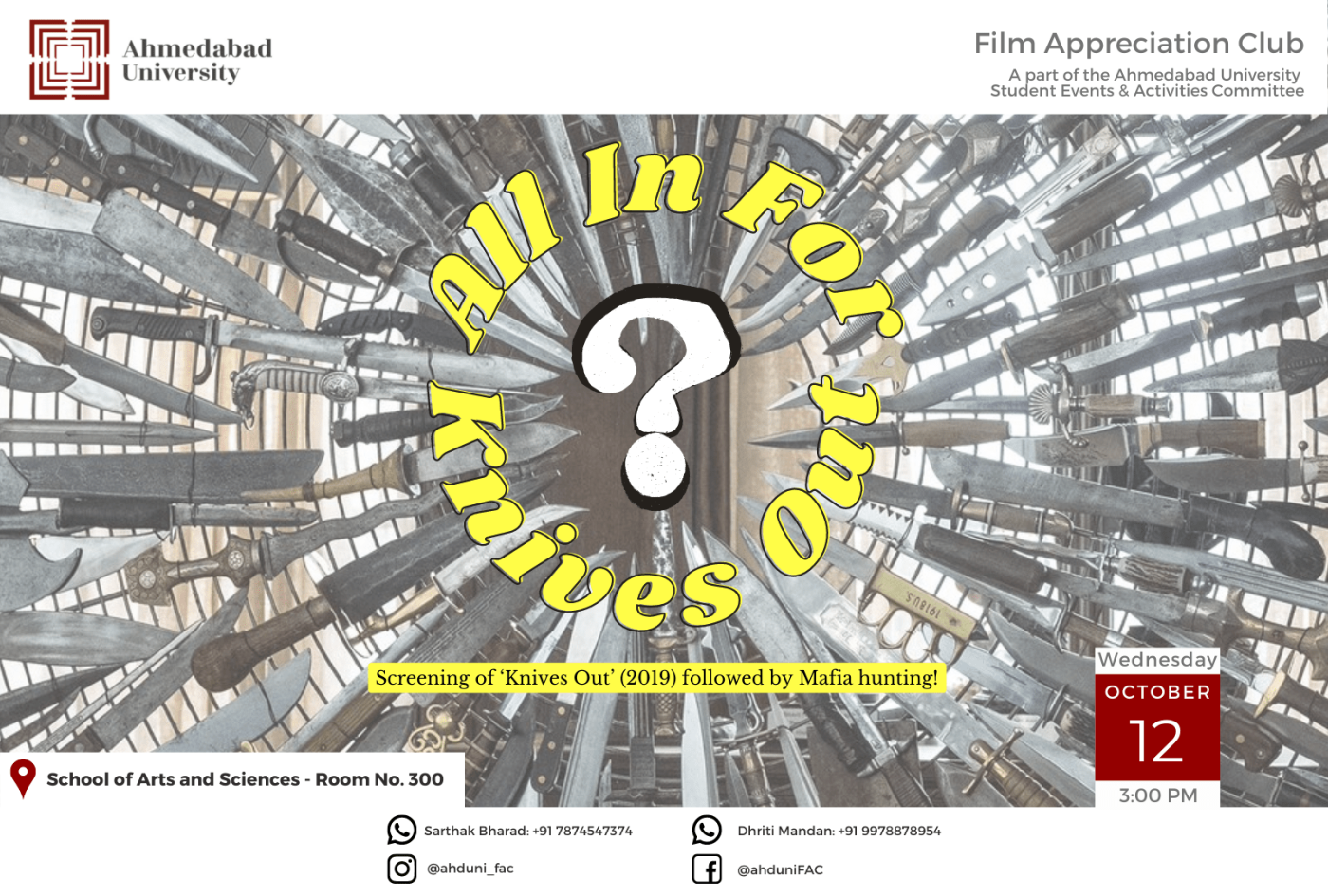 Post the mid-semester week, would you like to challenge yourself anew with a whodunit? Join us for a screening of Knives Out (2019) followed by a game of Mafia and get on a solving spree!