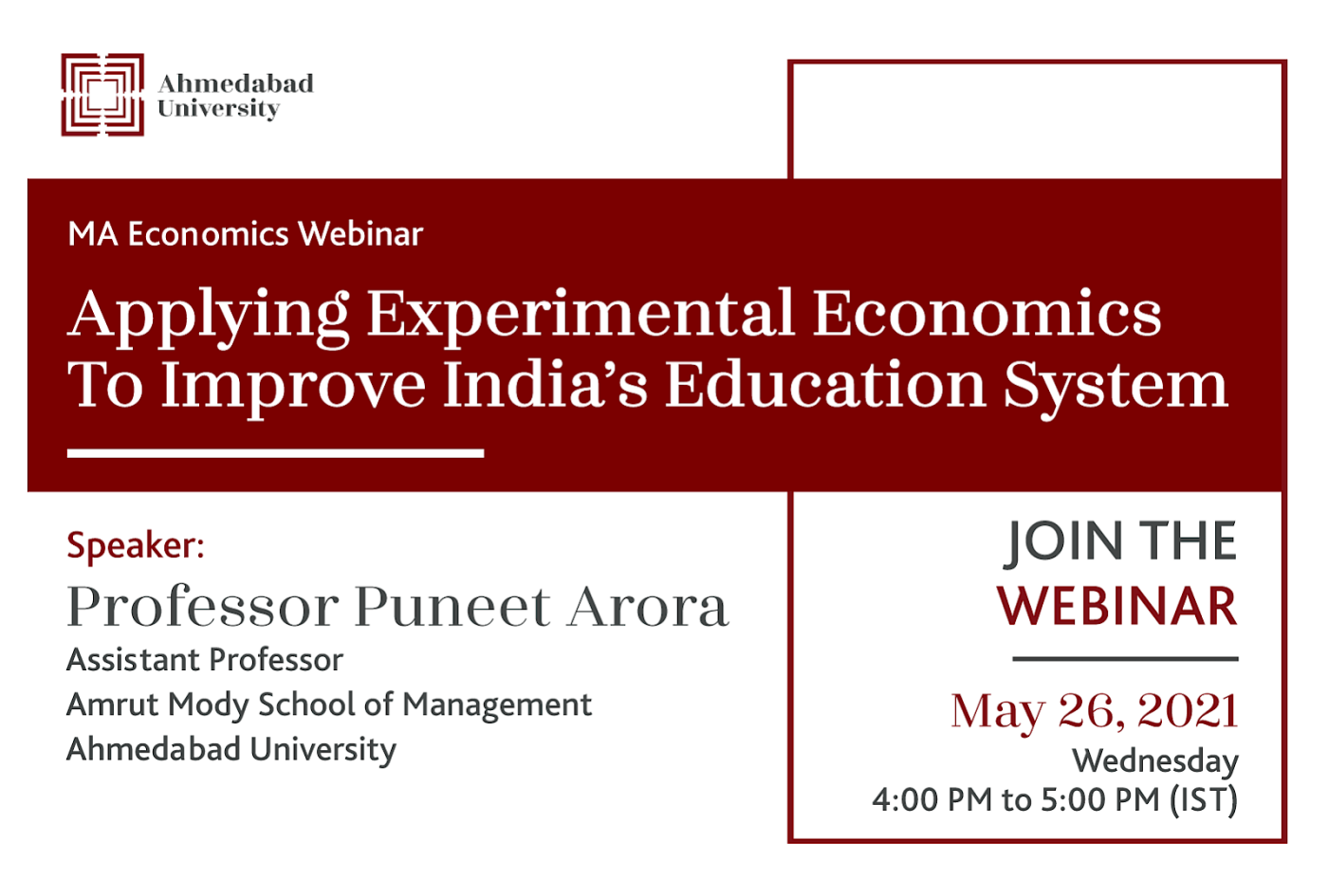 Ahmedabad University's MA Economics programme aims to prepare students who are theoretically sound and apply the concepts to the real world. As part of our outreach for the ma programme, we will discuss India's education system from the lens of experimental economics.