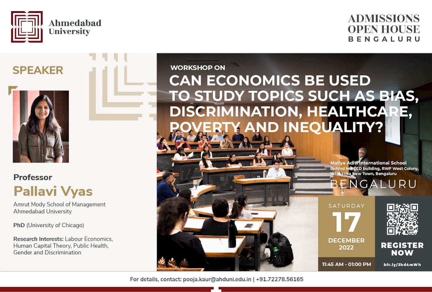 In this talk, Professor Pallavi Vyas will discuss how economists use theoretical frameworks to analyse social issues like bias, discrimination, healthcare, poverty, and inequality. She will also discuss her research on 'son preference' and domestic violence against women in India.