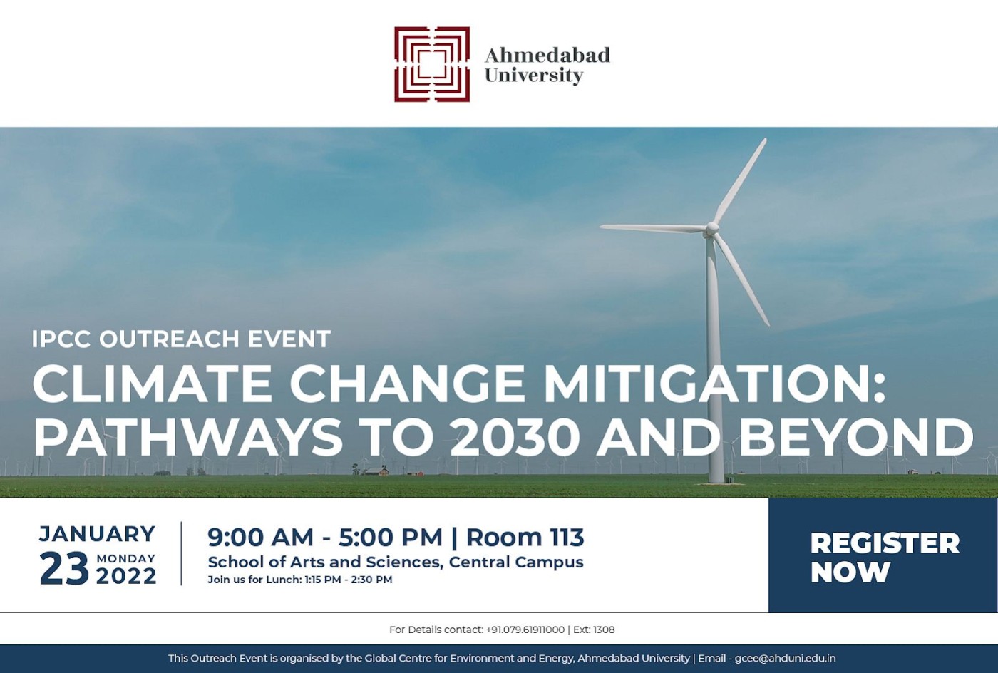 Global Centre for Environment and Energy at Ahmedabad University is hosting a full-day outreach event, 'Climate Change Mitigation: Pathways to 2030 and Beyond', to disseminate findings of the Intergovernmental Panel on Climate Change’s (IPCC) Sixth Assessment Report (AR6) on January 23, 2023, at Ahmedabad University.