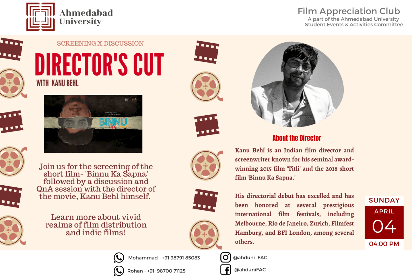 The Film Appreciation club brings to you “Director’s cut “, in which we will screen the movie- Binnu ka Sapna and it will be followed by elucidation By Mr. Kanu Behl (Indian film director and screenwriter) of the vivid realms and have a discussion about film distribution, the films that he has made, independent production, and many different aspects of indie films in India followed by a Q&A session.