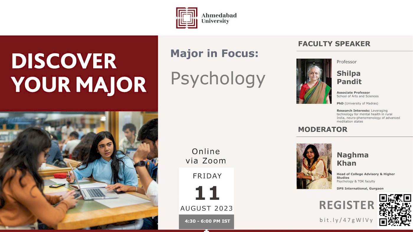 For Psychology session: A curated dialogue to delve deeper into the realm of Psychology and discuss the Liberal Education approach to learning, that emphasises breadth of knowledge, critical thinking, and interdisciplinary exploration. Join the PSYCHOLOGY session (On Zoom), featuring Professor Shilpa Pandit, PhD (University of Madras), and Ms Naghma Khan, Head of College Advisory (DPS International- Gurgaon) on Friday, August 11, 2023 at 4:30 PM. Learn about the cutting-edge research and exciting opportunities available to students pursuing these programmes at Ahmedabad University.