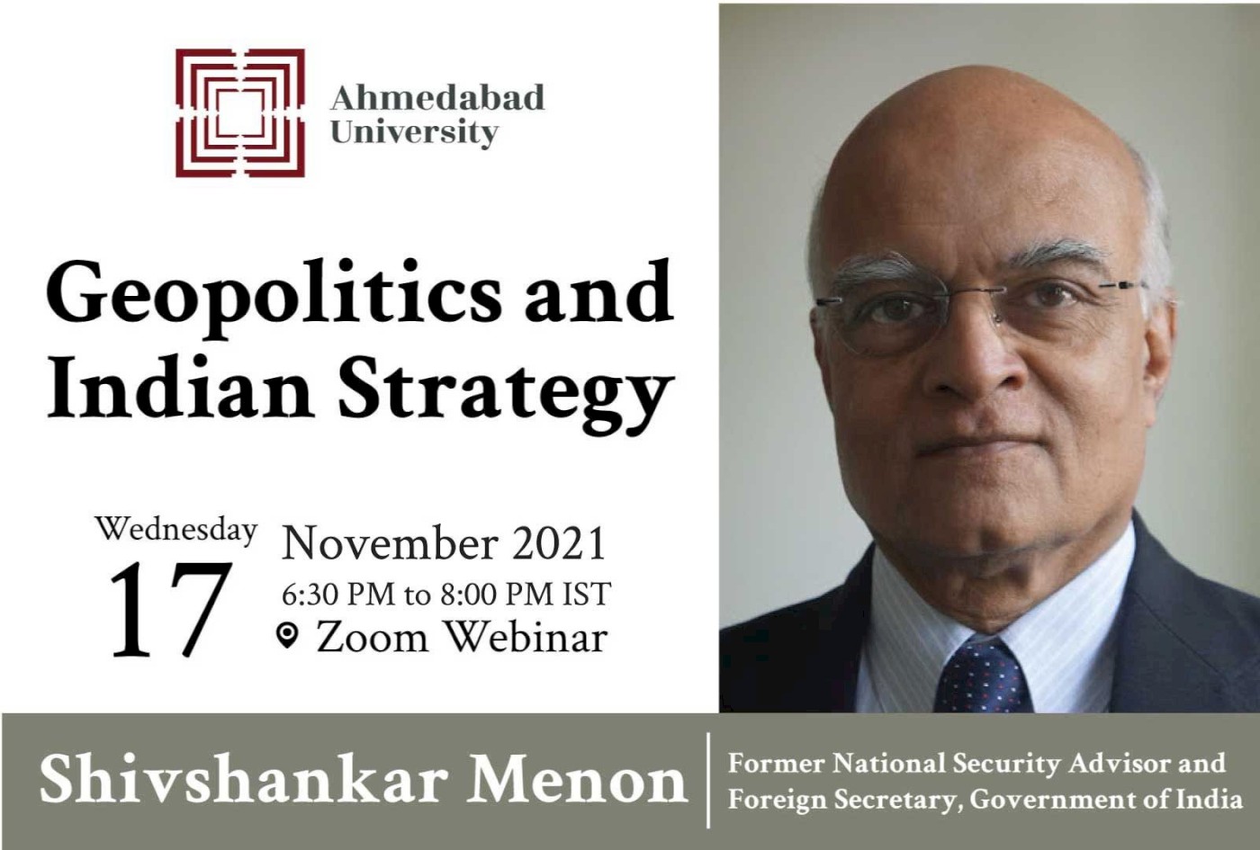 Speaker: Ambassador Shivshankar Menon is currently visiting professor at Ashoka University, and Chair of the Ashoka Centre for China Studies. He was previously the National Security Advisor to the Prime Minister of India, January 2010-May 2014; Foreign Secretary of India, October 2006-July 2009; and has also served as the Indian Ambassador or High Commissioner to China, Pakistan, Sri Lanka and Israel. His book India and Asian Geopolitics: The Past, Present (Brookings Press USA, & Penguin Random House India) was released in April 2021. He has been a Fisher Family Fellow at the Kennedy School, Harvard University, and a Richard Wilhelm Fellow at MIT in 2015. He was chosen as one of the “Top 100 Global Thinkers” by Foreign Policy magazine in 2010.