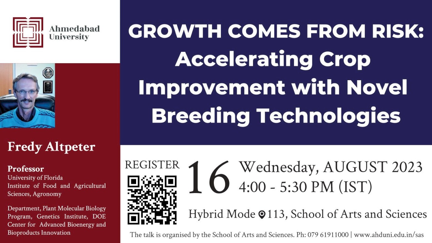 Fredy Altpeter is a Professor of Plant Molecular Biology and Physiology at University of Florida, Gainesville, USA. His research programme integrates traditional plant breeding, translational genomics, biotechnology, and genome editing to identify critical heredity units and develop genetically improved cereals, turf, and biomass/bioenergy grasses. He has served as an associate editor for many reputed journals. He has been awarded the University of Florida Research Foundation Professorship in 2013 and 2018, SIVB Distinguished Scientist Award in 2020, SIVB Fellow in 2018 and CSSA Fellow in 2021. He is visiting Ahmedabad University on the Rasila and Chandrakant Kadia Endowed Visiting Professorship.