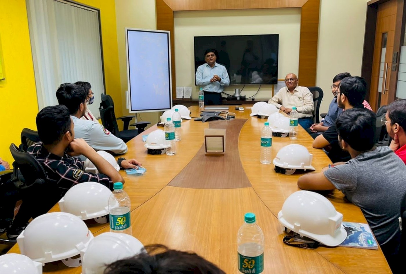 At Atul Limited, Vice President, Mr Syamalkumar De and Head -ESH, Shri Karan Savalia gave the students a tour of the various units such as p-Cresol chemical plant, distillation unit, mixed Cresol and p-Cresol storage, wastewater treatment plant—primary and secondary, reverse osmosis and multiple effect evaporator. At Meghmani Organics Limited, the students listened to a welcome address and presentations by Sr. Manager- ESH, Mr Hitesh Mistry and Asst. General Manager-Quality Control, Mr Amrutbhai Patel. They saw various types of pressure and temperature measuring devices, fire extinguishers, valves etc. in the training room and learned about their use. They visited the quality control laboratory, wastewater treatment facility and storage facilities for raw material and finished products.