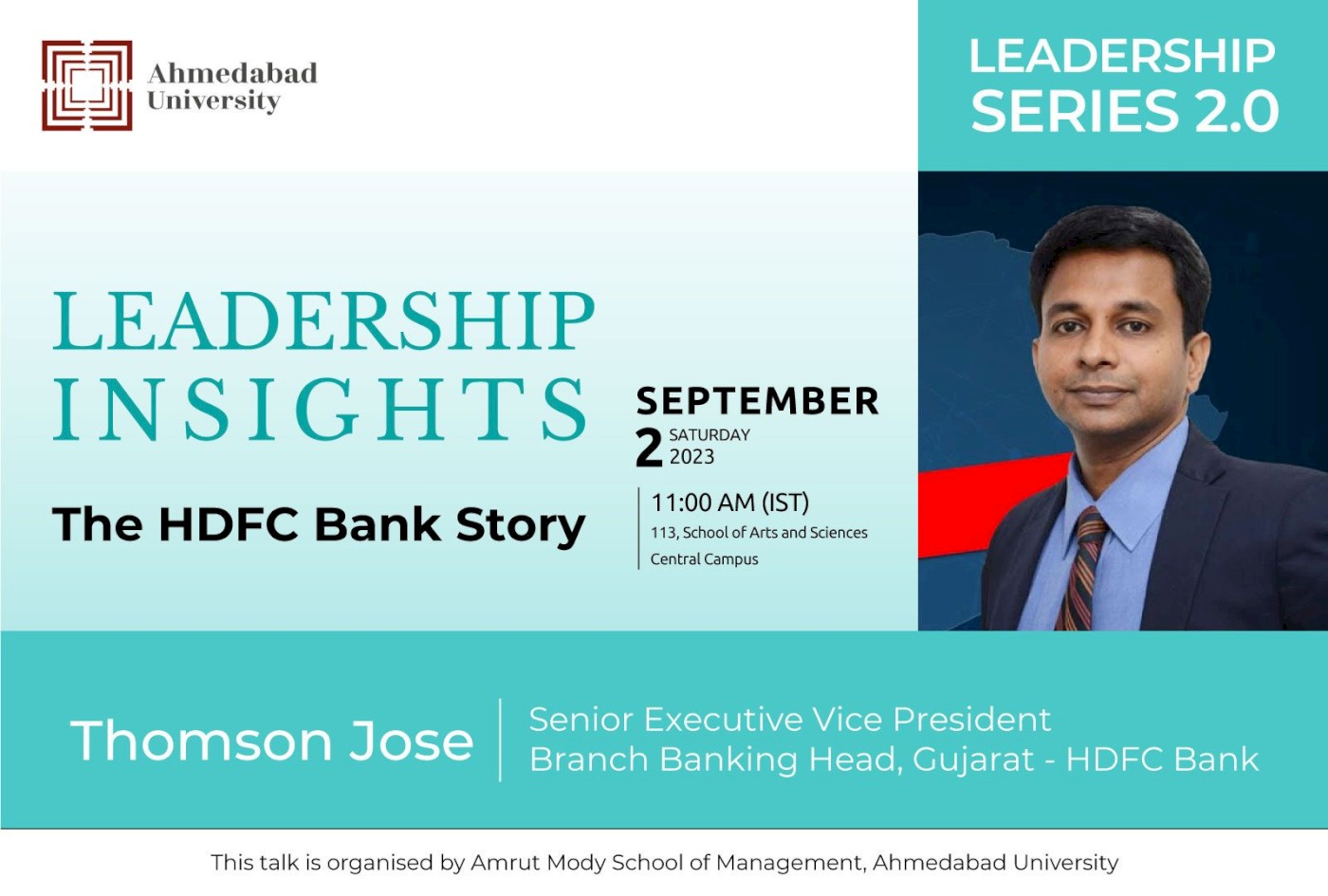 Thomson Jose, Senior Executive Vice President, Branch Banking Head, Gujarat, HDFC Bank has an experience of27 years in retail and consumer banking. He is responsible for 675 branches and about 4500 employees at HDFC Bank in Gujarat. He has a rich experience in handling distribution of both Retail Liabilities and Assets. He leads and builds teams in Retail Banking both Direct sales and Branch Banking. He also has a vast experience of working in varied Rural, Semi Urban, Urban and Metropolitan markets in India having worked in South, North and Western India.