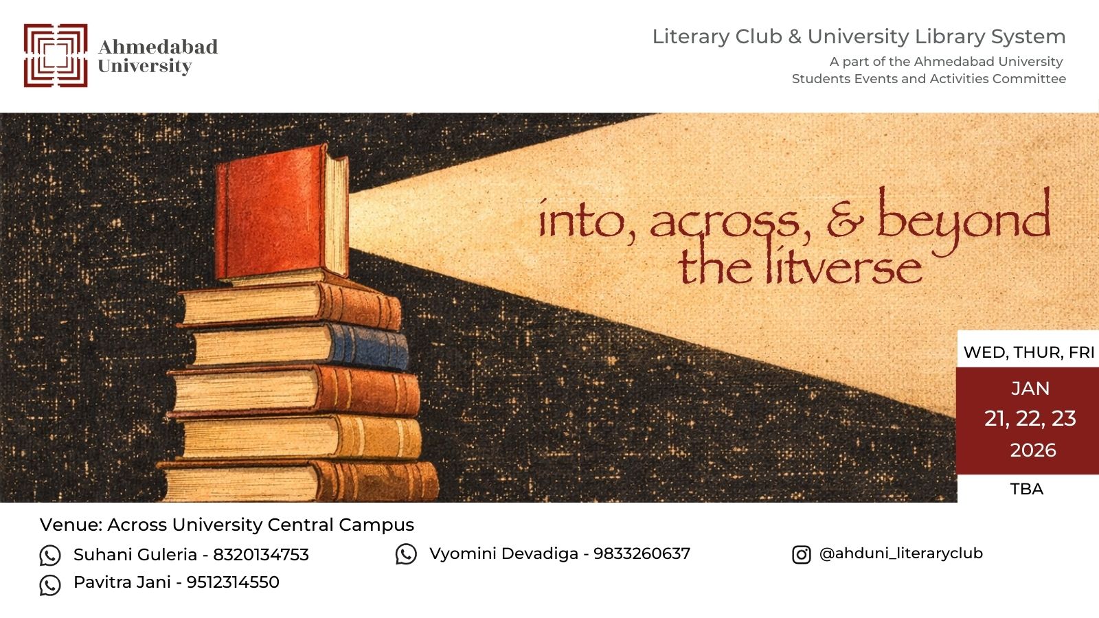 The Literary Festival of 2024 was a remarkable success: with five events and three desk-based engagements held across three days, the festival witnessed overwhelming participation and energy from students, faculty, and members of the Ahmedabad University community. Building on last year’s momentum and the expectations it has created, The Literary Club is delighted to announce its annual Literary Festival, scheduled for January 21-23, 2026, in collaboration with the University Library System.