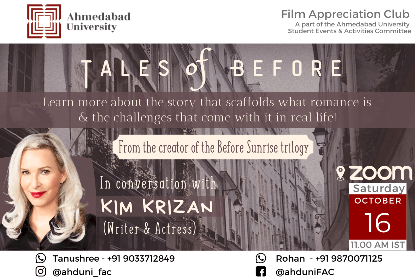 'Tales of Before', an engaging webinar with the co-creator of the cult classics Before Sunrise and Before Sunset, Kim Krizan.