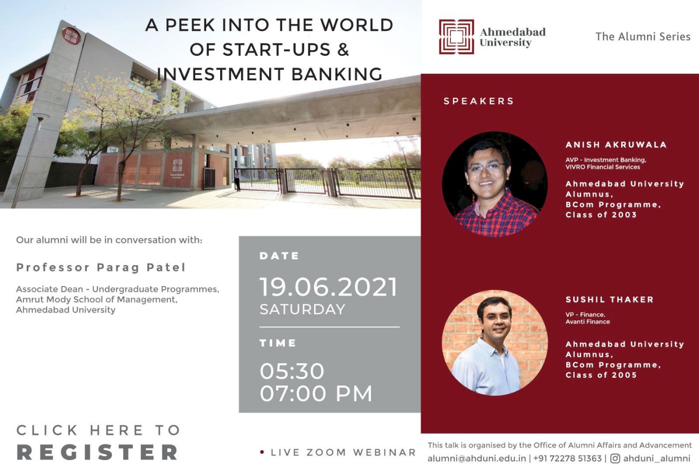 We bring to you an opportunity to interact with cognoscenti in the fields of Start-ups and Investment, who are well aware of the nooks and crannies of the corporate world. Our speakers for the series, Mr Anish Akruwala and Mr Sushil Thaker will provide some incredible insights into the realm of finances.