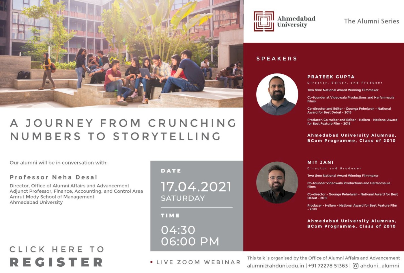 This interaction will provide our Alumni Community with a platform to connect with their batchmates and the Ahmedabad University Community, leading to personal and professional networking opportunities.