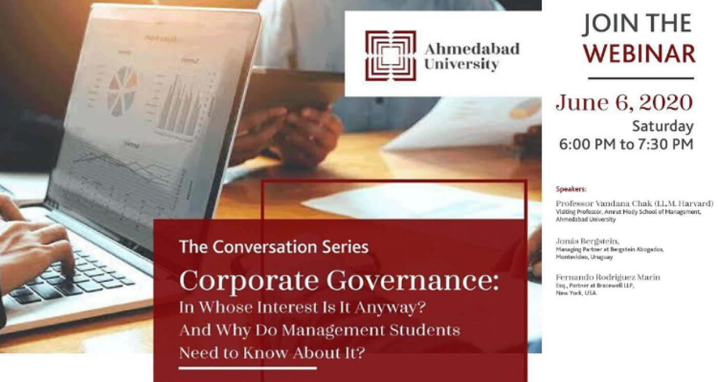 Professor Vandana Chak, Visiting Professor, Amrut Mody School of Management, Ahmedabad University will be in conversation with Jonás Bergstein, Managing Partner at Bergstein Abogados, Montevideo, Uruguay and Fernando Rodriguez Marin Esq., Partner at Bracewell LLP, New York on ‘Corporate Governance: In Whose Interest Is It Anyway? And Why Do Management Students Need To Know About It?’ at the next session of The Conversation Series. The webinar, to be held on June 6, 2020, will focus on the common foundations of corporate governance worldwide. It will examine board-management relationships in two contemporary business landscapes: private company boards with directors having competing interests, and investors seeking environmental, social, and governance compliance from boards and management in project finance.