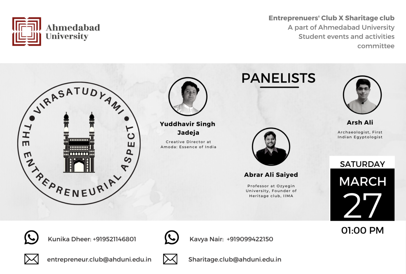 Entrepreneurs’ Club in collaboration with Heritage Club presents to you Virasat Udyami: The Entrepreneurial Aspect!, a panel discussion to resolve all your queries on Heritage Entrepreneurship.