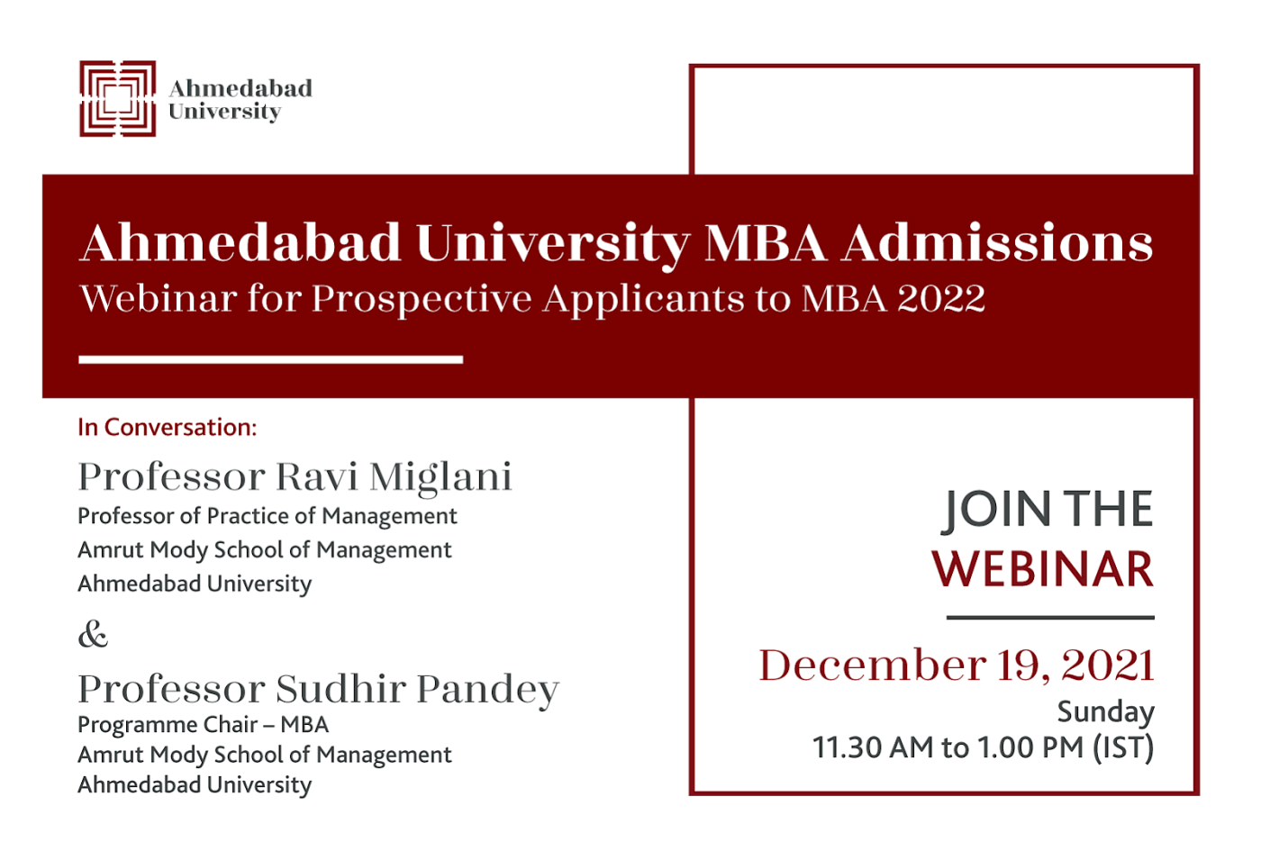 Ahmedabad University is organising an exclusive MBA Programme Admissions Webinar which is going to take place on Sunday, 19 December 2021 at 11.30 am.