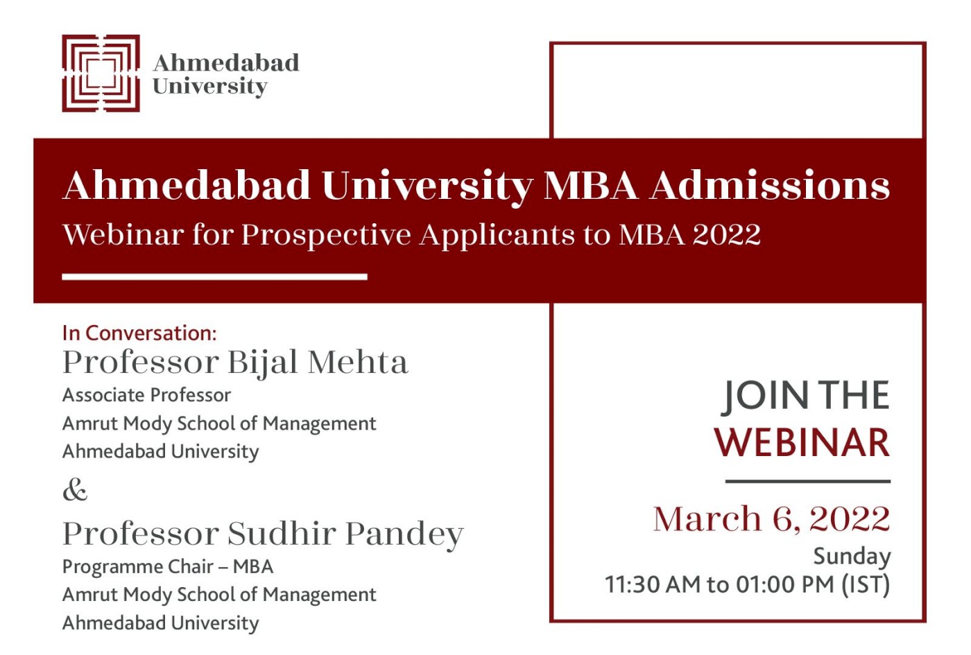Ahmedabad University is organising an exclusive MBA Programme Admissions Webinar on March 6, 2022 at 11:30 am. The webinar will be chaired by Professor Bijal Mehta (Associate Professor), Professor Sudhir Pandey (Programme Chair - MBA), representatives of MBA Programme participants, and Mr Swetangkumar Panchal (Manager - MBA Admissions and Branding) to address the queries and doubts of prospective MBA applicants of the upcoming MBA 2022 batch.