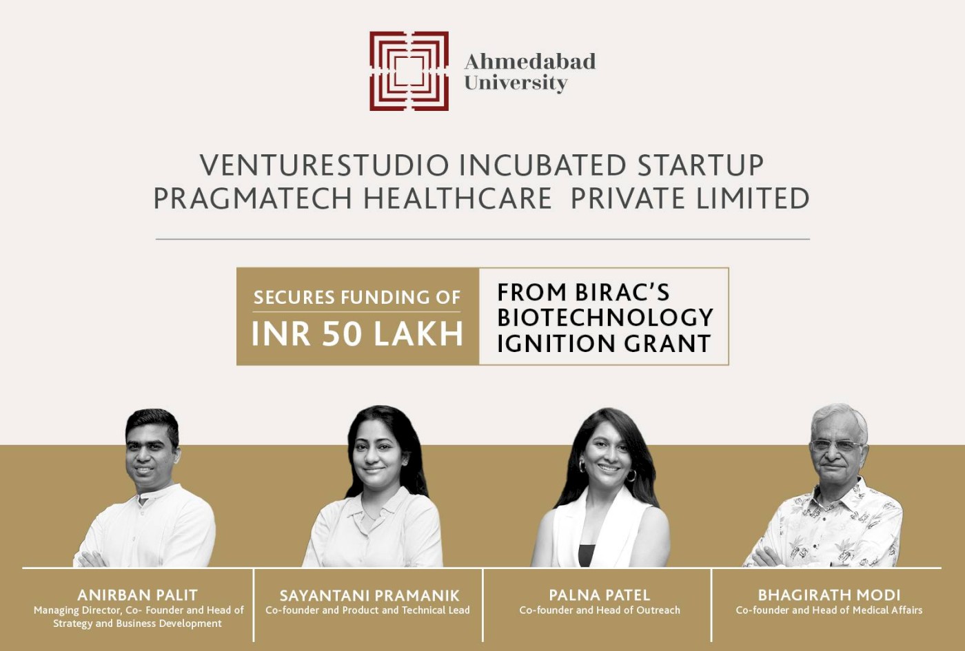 Ahmedabad University’s VentureStudio startup Pragmatech Healthcare Solutions Private Limited has received a funding of Rs 50 lakhs under the Biotechnology Ignition Grant (BIG) scheme by the Biotechnology Industrial Research Assistance Council (BIRAC). The healthtech startup has had a year-long association with VentureStudio.