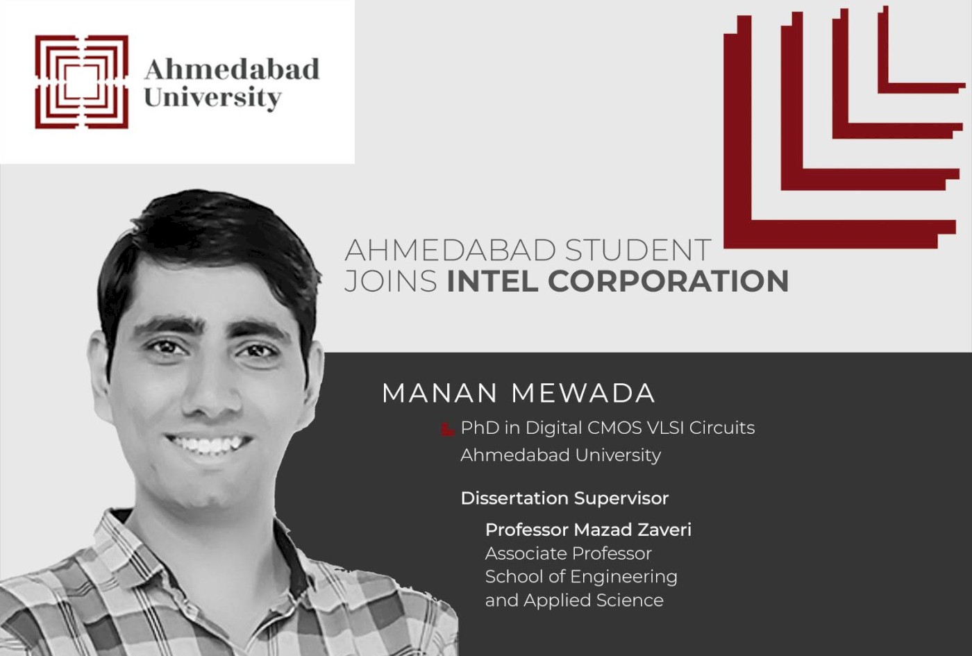Manan Mewada, who completed his PhD from Ahmedabad University, has joined Intel Corporation as ASIC PDK Development Engineer. He did his doctoral research in the area of Digital CMOS VLSI circuits focusing on low power-delay hybrid CMOS full adder designs (for computer arithmetic structures) and their characterization under the supervision of Professor Mazad Zaveri, Associate professor, Ahmedabad University. He has published research papers in journals of international repute such as Integration (Elsevier), Procedia Computer Science (Elsevier), Communications in Computer and Information Science (Springer), and IEEE conferences.
