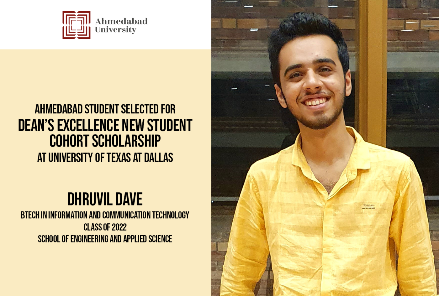 Dhruvil Dave, BTech (Information and Communication Technology), School of Engineering and Applied Science, Class of 2022, has been selected for the Dean's Excellence New Student Cohort Scholarship at The University of Texas at Dallas (UTD) where he will be pursuing a Master of Science in the Business Analytics Cohort programme, Data Science track.