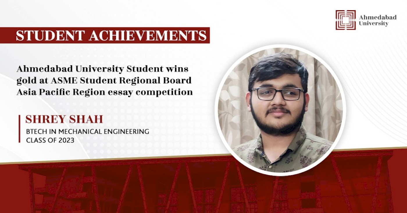 Shrey Shah, a third-year Mechanical Engineering student at the School of Engineering and Applied Science bagged a gold medal in an article writing competition organized by the American Society of Mechanical Engineers (ASME) Student Regional Board Asia Pacific Region. This competition was open to ASME students across the Asia Pacific.