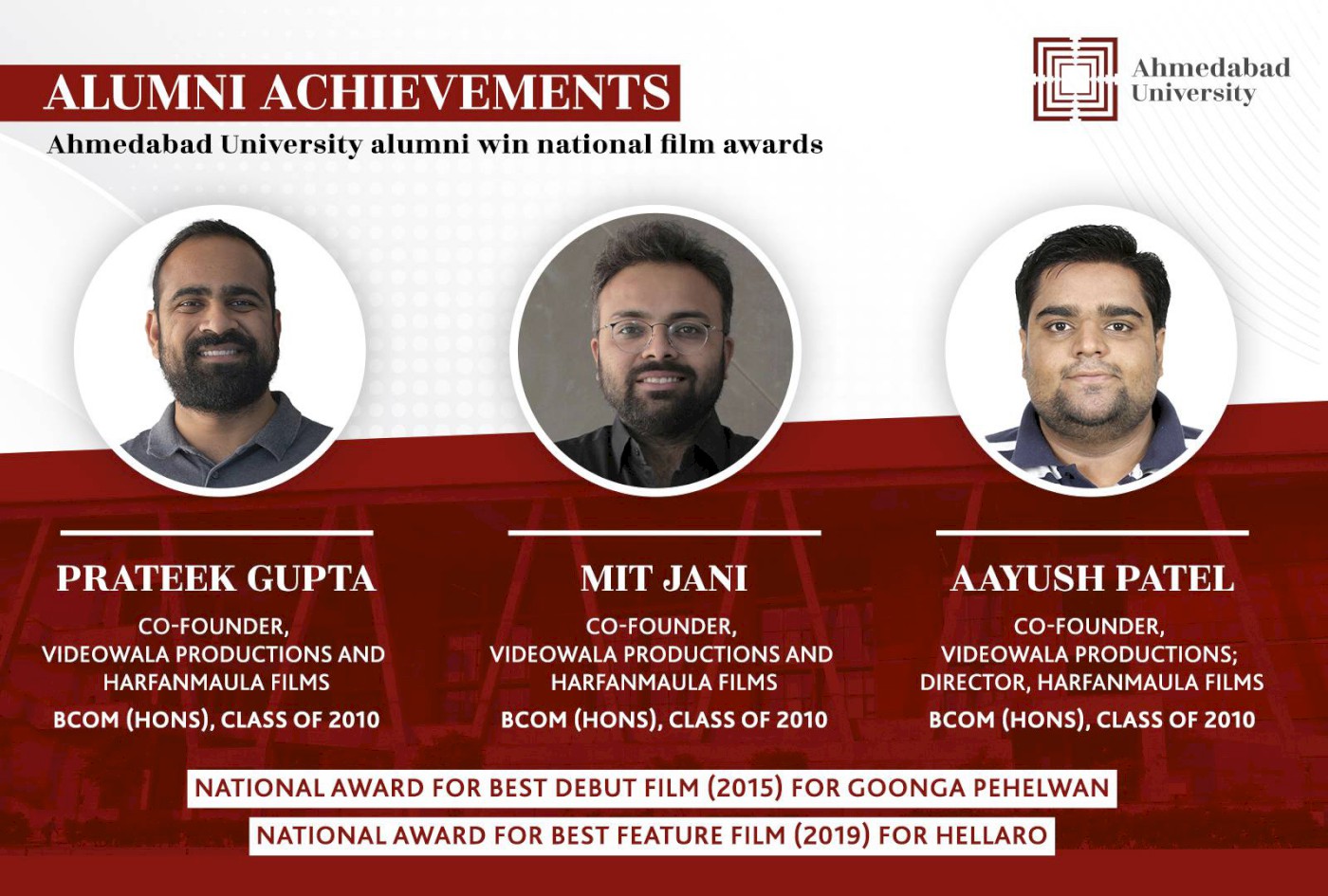 For Gujarati cinema, Hellaro signals a definite change; for Ahmedabad University, a moment of immense pride as the key people behind the movie - Prateek Gupta, Mit Jani and Aayush Patel, co-founders of production houses Videowala Productions and Harfanmaula Films - are alumni from the BCom (Hons) with Major in Accounting, Class of 2010, Amrut Mody School of Management. While all three were the co-producers for Hellaro, Prateek additionally co-wrote and edited it too. However, it isn’t the first time that the trio has been lauded for its work. Their 2013 feature-length documentary Goonga Pehelwan, about the life and struggles of Padma Shri and Arjuna awardee wrestler Virendra Singh Yadav who has a hearing disability, had won at the 62nd National Film Awards of 2014 for Best Debut Film of a Director in the non-feature film category. Prateek and Mit, along with a friend, had co-directed Goonga Pehelwan while Pratik had also edited it.