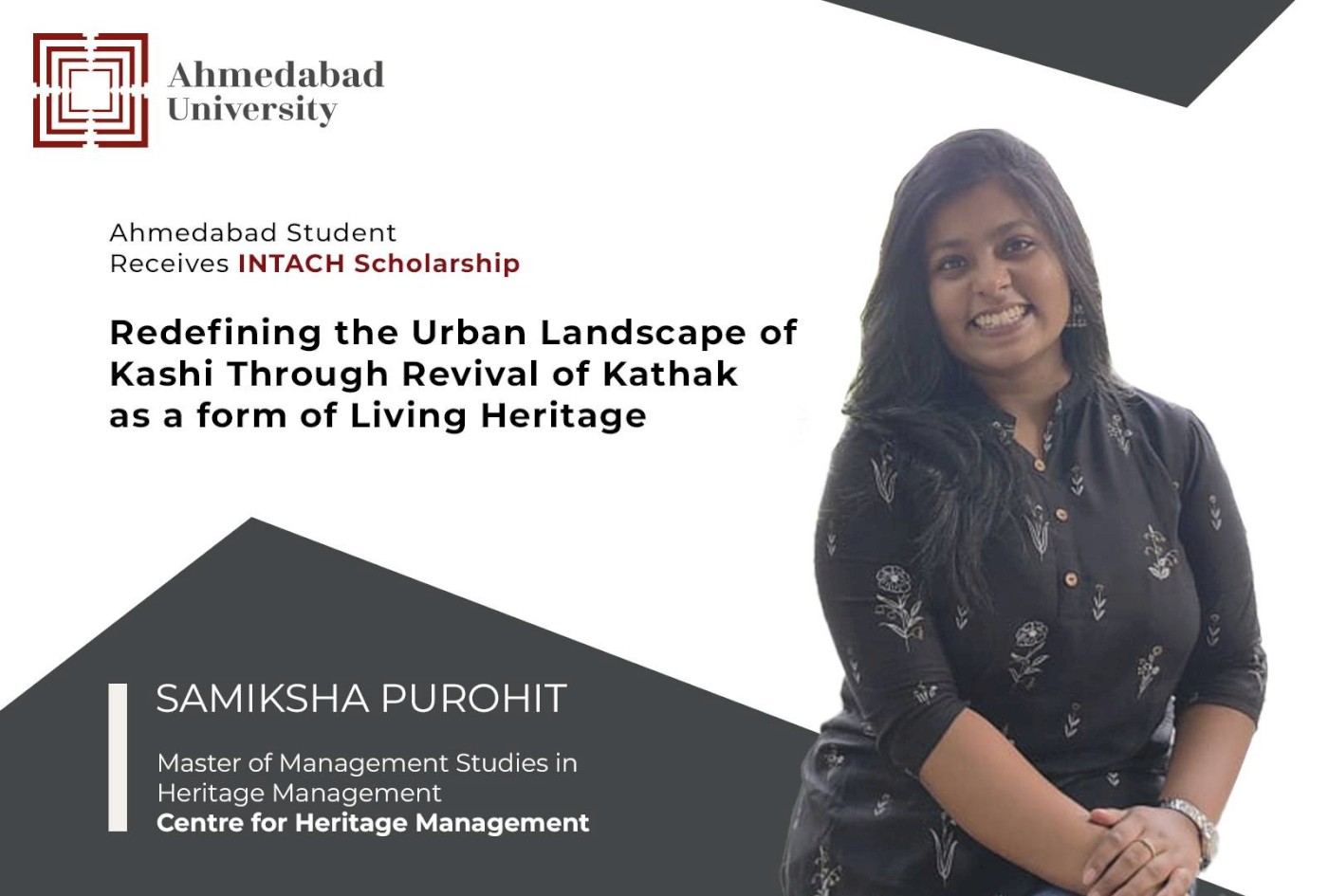 With a visharad degree in Kathak, history graduate Samiksha Purohit had always wanted to work on something that allowed her to blend her knowledge of both these subjects and use them to create social impact. Pursuing her MMS in Heritage Management at Ahmedabad’s Centre for Heritage Management, Class of 2022, has given this Delhi girl precisely that opportunity. Samiksha has recently received a Scholarship worth Rs 3 lakhs from the Indian National Trust for Art and Cultural Heritage (INTACH) to research the topic ‘Redefining the urban landscape of Kashi through revival of Kathak as a form of living heritage,’ also the theme for her master’s thesis.