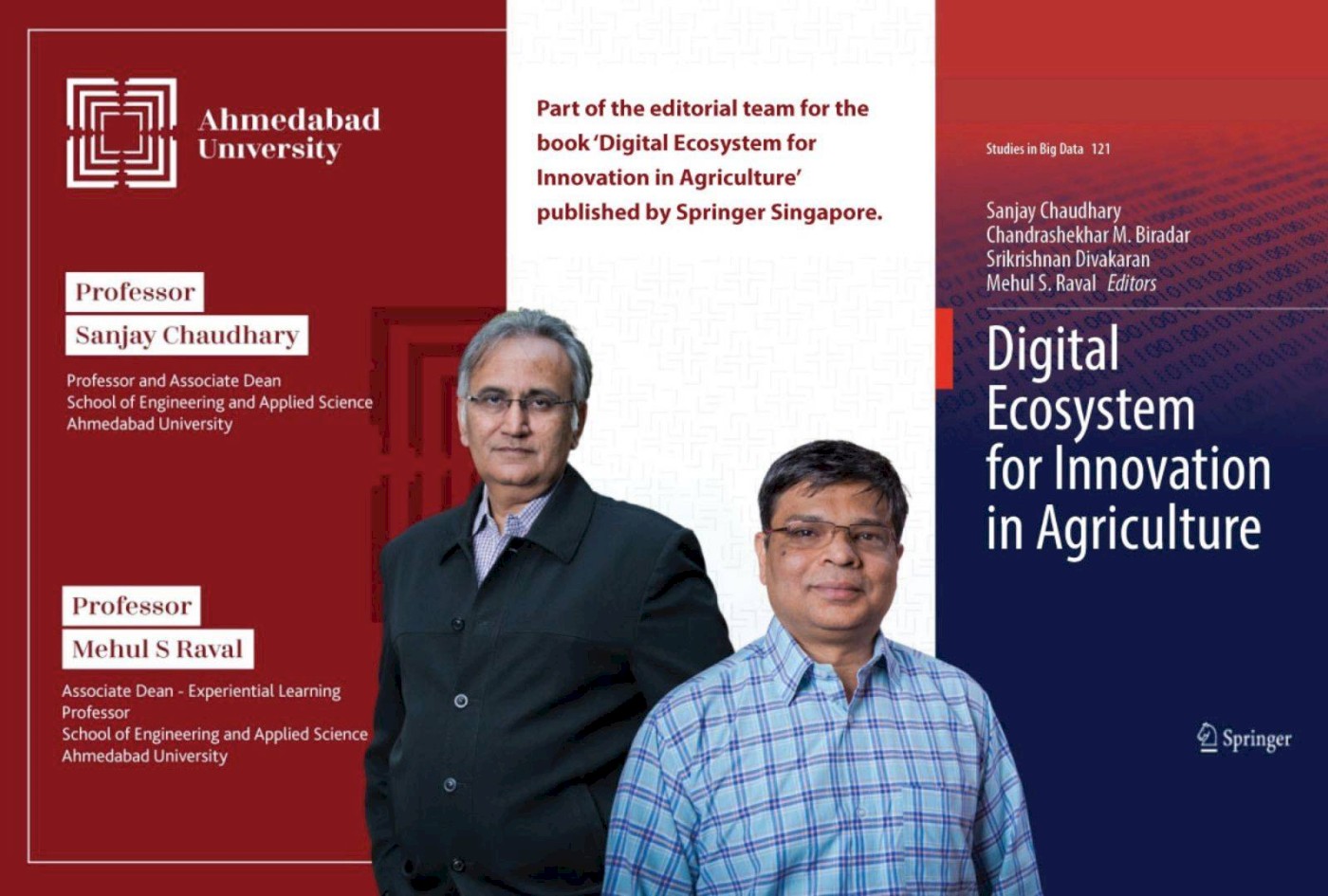With the world population projected to reach 9.8 billion in 2050, the use of Data Science in agriculture has gained significant ground. There is an immediate need to pilot innovative ideas for collecting data on soil, water tables, and minerals, and use prediction methodologies for climate changes. A new book, Digital Ecosystem for Innovation in Agriculture, brings together the perspectives and the latest findings in the areas of digital ecosystem for innovation in agriculture by a group of top academicians across the world. Co-edited by Sanjay Chaudhary, Professor and Associate Dean, School of Engineering and Applied Science; and Mehul Raval, Professor and Associate Dean of Experiential Learning, School of Engineering and Applied Science, along with other domain experts, the book understands geospatial, data science, agricultural, and environmental sciences in the context of innovation in agriculture. Professor Chaudhary has contributed to the spatio-temporal data science perspective while Professor Raval has contributed to the computer vision, image processing, and deep learning viewpoints.
